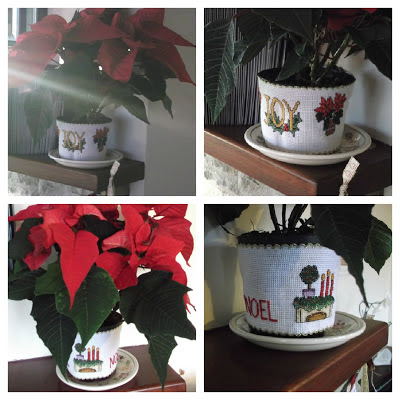 Earlier on in the month, I promised to pop back here and show you the little pot covers that I've been stitching to cover the ugly black pots that my poinsettias are in...